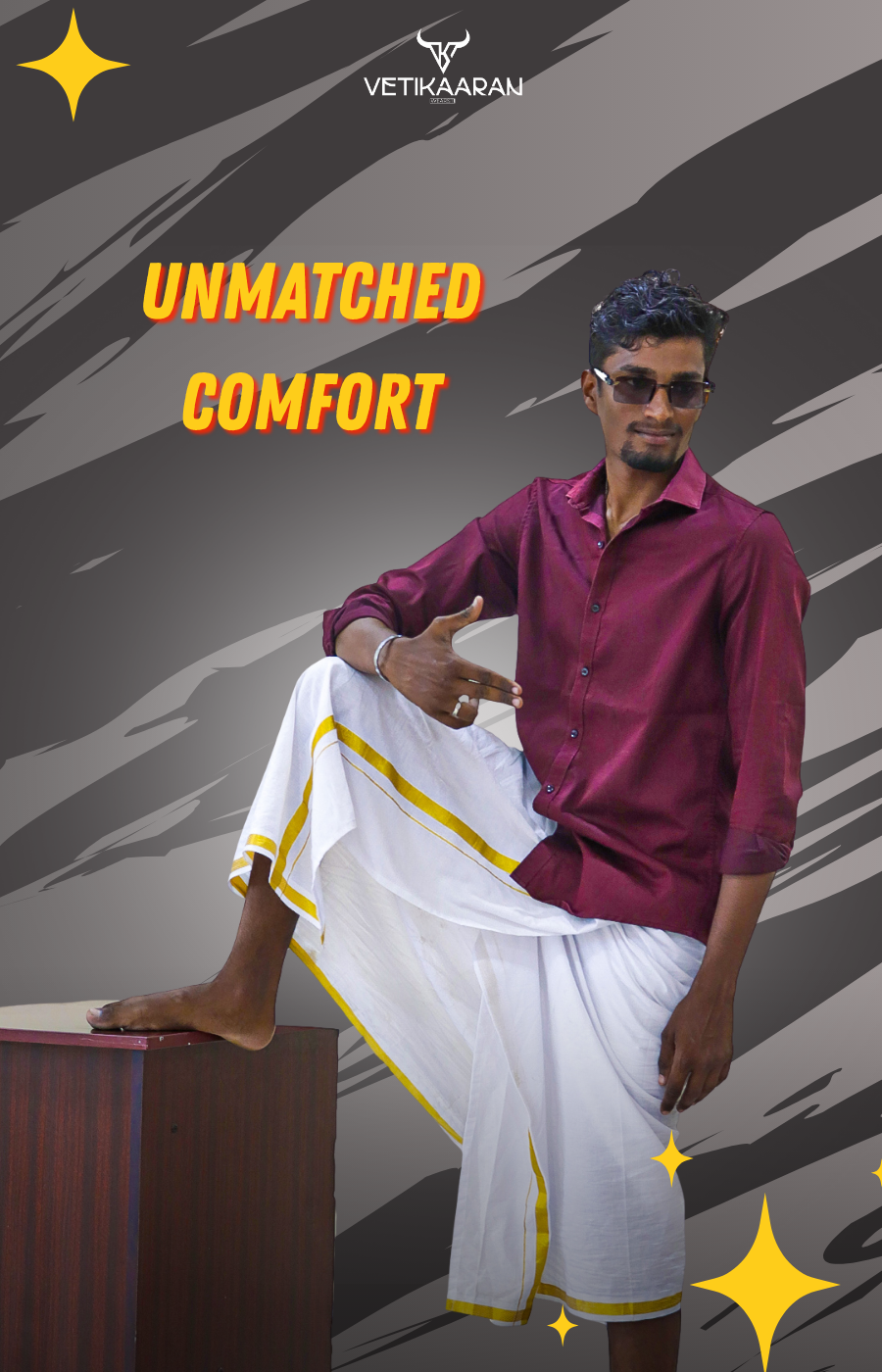 Forget the fear of loosening—our Veshti’s elastic and drawstring keep you comfortable and confident all day